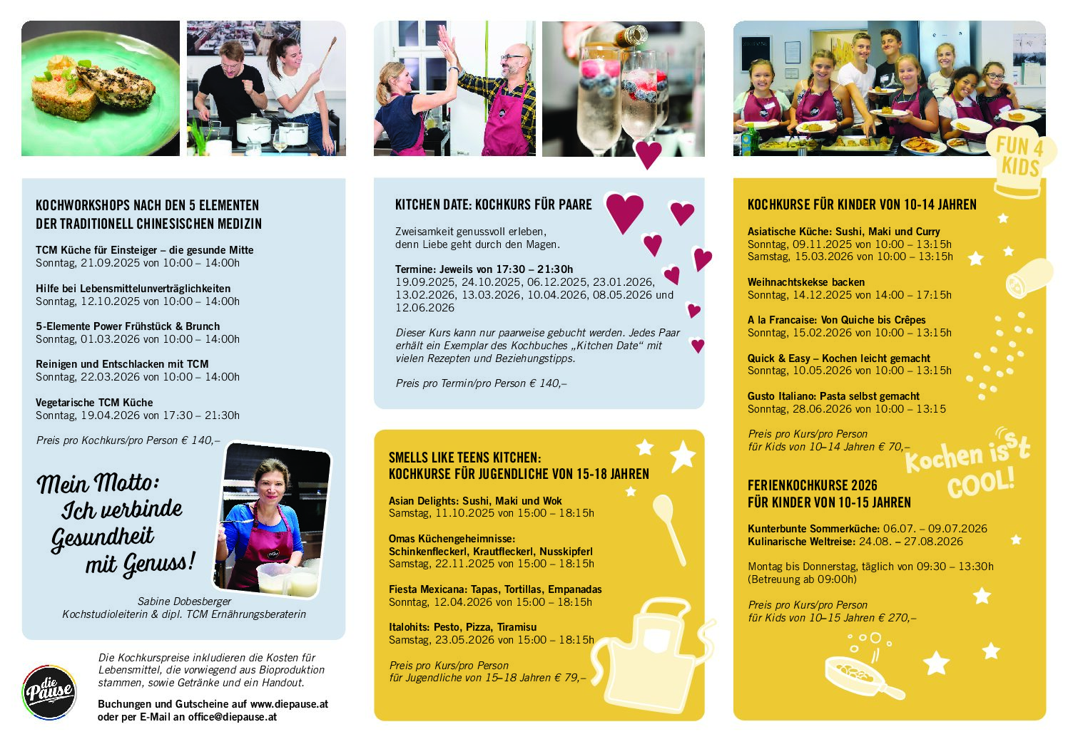 Für Ihren individuellen Kurs mit Freunden und Familie stellen wir gerne ein Programm nach Ihren Wünschen für Sie zusammen. Buchen Sie unser Package für einen exklusiven Kochkurs für bis zu 8 Personen. Unser vielfältiges Kochkursprogramm liefert sowohl für Anfänger als auch für HobbyköchInnen neue Ideen für den täglichen Genuss. Gutscheine für Kochkurse in Wien im Kochstudio „die Pause“ am Spittelberg gibts unter: office@diepause.at.